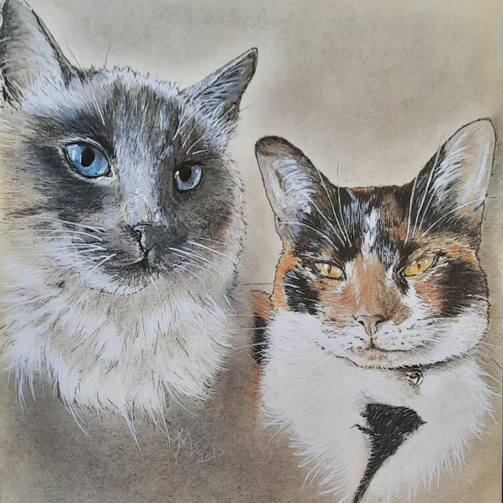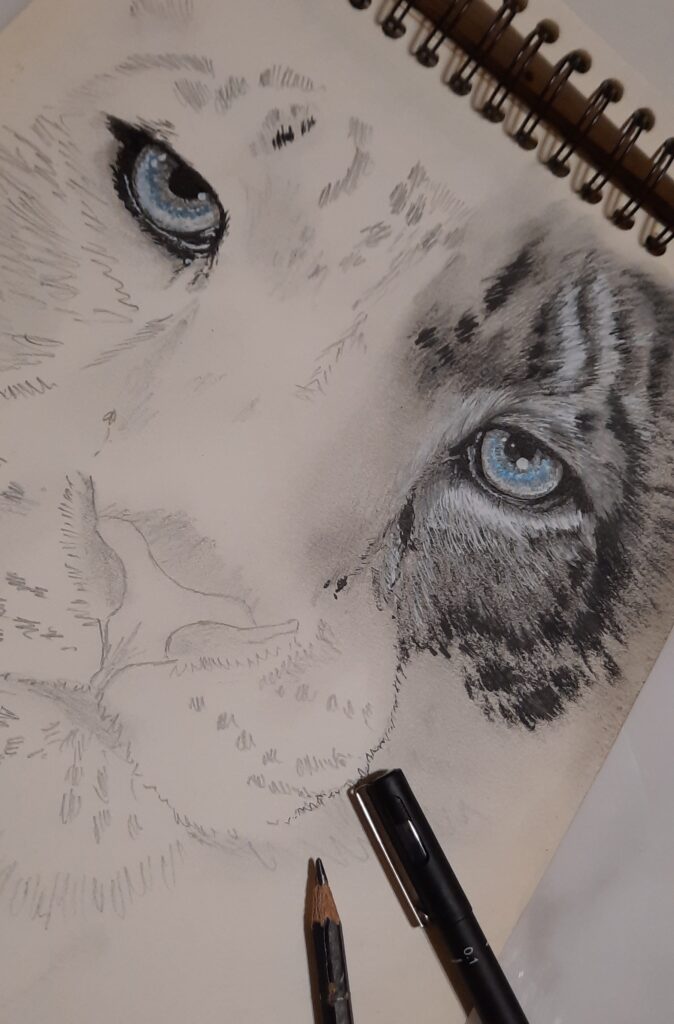 Puis, elle s’est mise à plus travailler le dessin, sur nuance de noir et blanc, avec quelques touches de couleur pour le rendre vivant, en s’inspirant du dessinateur espagnol Luis Royo. Elle utilise différentes nuances de graphites, et pour les détails différentes tailles de feutres fin (de 0,1 mm à 0,3mm). Ses inspirations : les animaux, l’Heroic Fantasy. Elle apprécie aussi de faire les portraits d’animaux de compagnie. Donc, si vous souhaitez immortaliser un moment de votre compagnon à poils, n’hésitez pas !